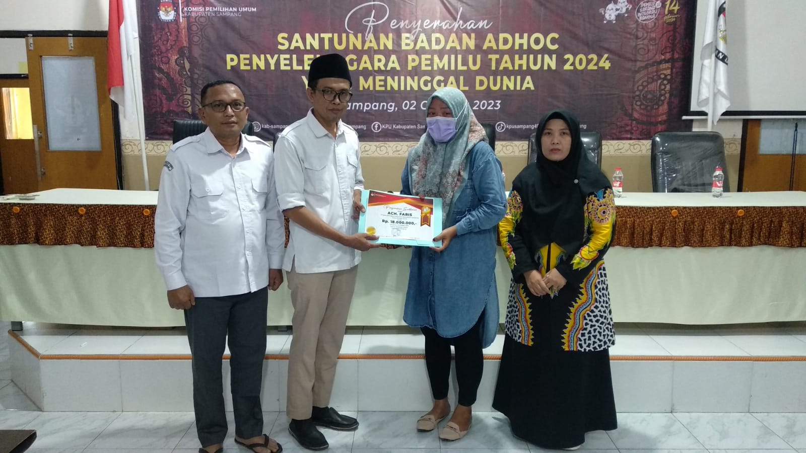 Sedikitnya ada tiga orang anggota badan adhoc pemilihan umum (Pemilu) 2024 di Kabupaten Sampang meninggal dunia. Mereka memperoleh santunan ahli waris dari Komisi Pemilihan Umum (KPU) Sampang Rp54 juta. Penyerahan santunan dilaksanakan di ruang Aula KPU Sampang, Senin (2/10/2023).